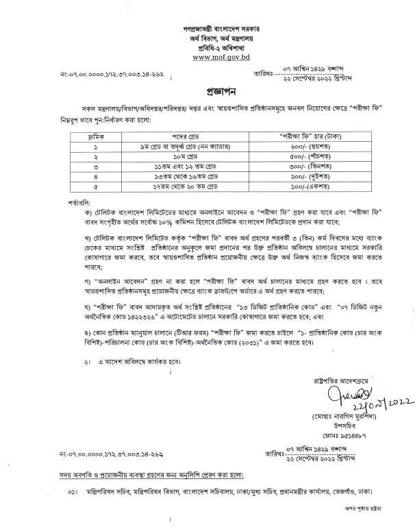 সরকারি সব প্রতিষ্ঠানে আবেদন ফি বা নিয়োগ পরীক্ষার ফি বাড়ানো হয়েছে। অর্থ মন্ত্রণালয়ের ওয়েবসাইটে এ সংক্রান্ত প্রজ্ঞাপনটি প্রকাশ করা হয়েছে। এরমধ্যে ১৩তম গ্রেড থেকে ২০তম গ্রেডের ফি দ্বিগুণ করা হয়েছে। এতে বলা হয়েছে, সব মন্ত্রণালয়, বিভাগ, অধিদপ্তর, পরিদপ্তর, দপ্তর এবং স্বায়ত্তশাসিত প্রতিষ্ঠানে জনবল নিয়োগের ক্ষেত্রে পরীক্ষা ফি পুন:নির্ধারণ করা হয়েছে। এসব সরকারি প্রতিষ্ঠানে জনবল নিয়োগের ক্ষেত্রে বিভিন্ন গ্রেডের পরীক্ষার ফি নির্ধারিত হারে বাড়ানো হয়েছে। তবে কয়েকটি গ্রেডের ফি অপরিবর্তিত রয়েছে।প্রজ্ঞাপন অনুযায়ী ৯ম গ্রেড বা তদূর্ধ্ব (নন-ক্যাডার) গ্রেডে পরীক্ষা ফি ৬০০ টাকা পুন:নির্ধারণ করা হয়েছে। এ গ্রেডের ফি আগে ছিল ৫০০ টাকা। ১৩তম থেকে ১৬তম গ্রেডে ১০০ টাকা থেকে দ্বিগুণ অর্থাৎ ২০০ টাকা করা হয়েছে। ১৭তম থেকে ২০তম গ্রেডেও ফি দ্বিগুণ হয়েছে। এই তিন গ্রেডে ৫০ টাকা থেকে বেড়ে ১০০ টাকা হয়েছে।