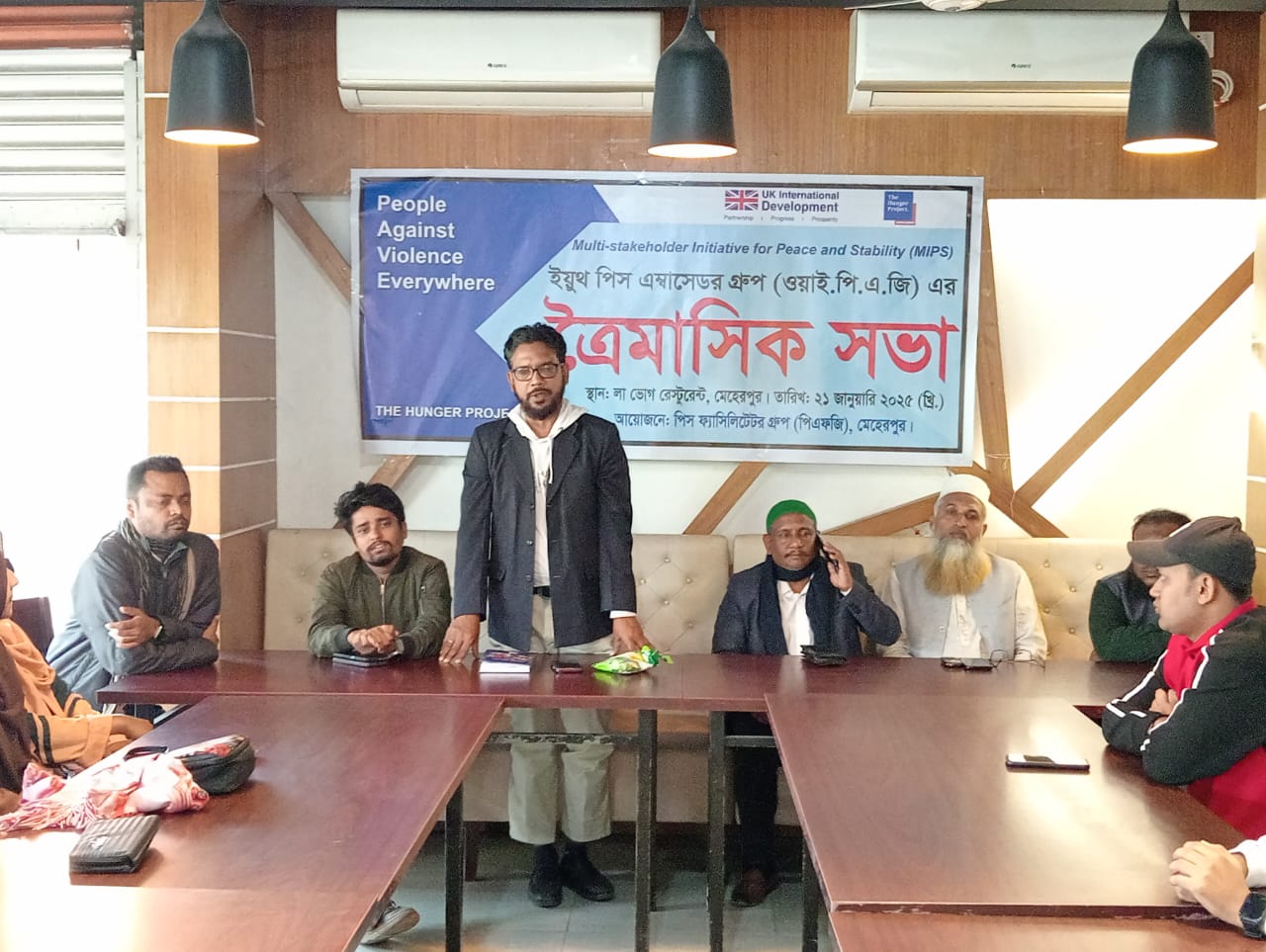 সভায় পিস এম্বাসেডর হিসেবে উপস্থিত ছিলেন জেলা স্বেচ্ছাসেবক দলের সাধারণ সম্পাদক আজমল হোসেন মিন্টু। এছাড়া ওয়াইপিএজির সমন্বয়কারী এবং ইয়েস বাংলাদেশ সংগঠনের প্রতিনিধি ও সাংবাদিক এস.এম. মেহেরাব হোসেন এবং সহ-সমন্বয়কারী ছাত্রদল নেতা লিজন আলী ও বৈষম্য বিরোধী ছাত্র আন্দোলনের আলমিন আলিফ খান সহ ছাত্রদল ও অন্যান্য রাজনৈতিক দলের ছাত্র প্রতিনিধি এবং বিভিন্ন সেচ্ছাসেবি সংগঠনের ওয়াইপিএজি সদস্যরা অংশগ্রহণ করেন। এসময় রাজনৈতিক, ধর্মীয়, এবং নৃগোষ্ঠীগত সম্প্রীতির উন্নয়নে বেশ কিছু গুরুত্বপূর্ণ সিদ্ধান্ত নেওয়া হয়। সার্বিক ব্যাবস্থাপনার দায়িত্বে ছিলেন ফিল্ড কোঅর্ডিনেটর আশরাফুজ্জামান।