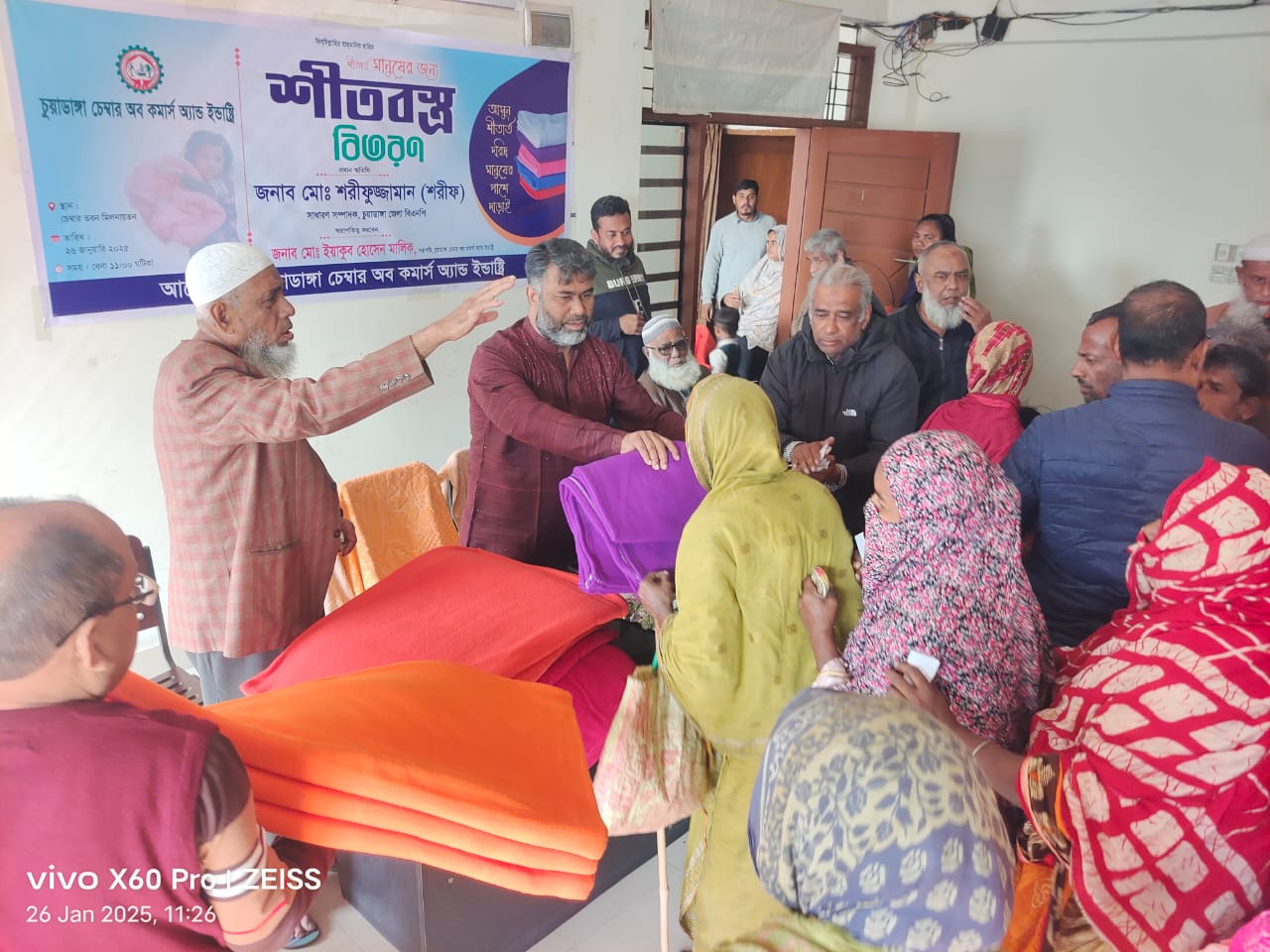 চুয়াডাঙ্গা চেম্বার অব কমার্স অ্যান্ড ইন্ডাস্ট্রিজের উদ্যোগে ৪০০ জন অসহায় শীতার্ত মানুষের মধ্যে শীতবস্ত্র (কম্বল) বিতরণ করা হয়েছে। গতকাল রোববার বেলা ১১টায় চুয়াডাঙ্গা চেম্বার ভবনে এই শীতবস্ত্র বিতরণ কার্যক্রম অনুষ্ঠিত হয়। বিতরণ অনুষ্ঠানে প্রধান অতিথি হিসেবে উপস্থিত ছিলেন জেলা বিএনপির সাধারণ সম্পাদ শরীফুজ্জামান শরীফ। প্রধান অতিথি বলেন, ‘প্রতি বছর শীতে আমাদের জেলার ছিন্নমূল মানুষের কষ্টের কারণ হয় শীতবস্ত্রের অভাব। অসহায় ও শীতার্ত মানুষের পাশে দাঁড়ানো আমাদের নৈতিক দায়িত্ব। আমরা সকলে যদি এগিয়ে আসি তাহলে, শীতার্তদের কষ্ট লাগব করা সম্ভব। চেম্বারের এই উদ্যোগে শীতার্ত অনেক পরিবারের মুখে হাসি ফুটিয়েছে। আমি প্রত্যাশা করি চেম্বারের এই উদ্যোগ আগামীতেও অব্যহত থাকবে।’