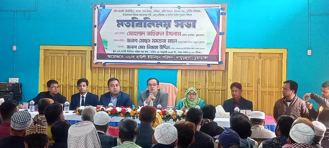 দামুড়হুদার হাউলী ইউনিয়ন পরিষদে ইভটিজিং, মাদক, বাল্য বিবাহ, জঙ্গিবাদ, ধর্মীয় উগ্রবাদ, কিশোর গ্যাং, দুর্নীতি প্রতিরোধ, আত্মহত্যার বিরুদ্ধে সচেতনতা সৃষ্টি, ডেঙ্গু প্রতিরোধ ও সার্বিক আইনশৃঙ্খলা বিষয়ক মতবিনিময় সভা ও বিশেষ উঠান বৈঠক অনুষ্ঠিত হয়েছে। এসময় রাজস্ব তহবিলের অর্থায়ানে গৃহীত প্রকল্পের বিপরীতে কৃষকের মধ্যে কৃষি সামগ্রী স্প্রে মেশিন ও দুস্থ মহিলাদের মধ্যে সেলাই মেশিন বিতরণ করা হয়। অনুষ্ঠানে ইভটিজিং, মাদক, বাল্যবিবাহ, কিশোর গ্যাংসহ উল্লেখিত অপরাধের বিরুদ্ধে প্রতিবাদ জানানো হয়েছে। গত মঙ্গলবার বেলা সাড়ে ১০টার দিকে দামুড়হুদা উপজেলার হাউলী ইউনিয়ন পরিষদের আয়োজনে পরিষদের সভাকক্ষে এ অনুষ্ঠানের আয়োজন করা হয়।