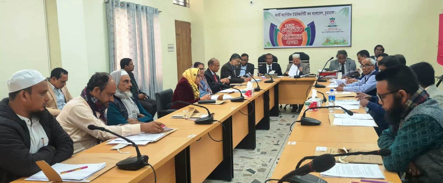 ফার্স্ট ক্যাপিটাল ইউনিভার্সিটি অব বাংলাদেশ চুয়াডাঙ্গার একাডেমিক কাউন্সিলের ২৩তম সভা অনুষ্ঠিত হয়েছে। গতকাল মঙ্গলবার বেলা ১১টায় ফার্স্ট ক্যাপিটাল ইউনিভার্সিটির সম্মেলন কক্ষে এই কাউন্সিলের সভা অনুষ্ঠিত হয়। সভায় সভাপতিত্ব করেন ফার্স্ট ক্যাপিটাল ইউনিভাসিটি অব বাংলাদেশ চুয়াডাঙ্গার ভাইস-চ্যান্সেলর প্রফেসর ড. এম. মোফাজ্জল হোসেন। সভায় উপস্থিত ছিলেন ডীন, কৃষি অনুষদ প্রফেসর ড. সিরাজুল ইসলাম, কুষ্টিয়া ইসলামী বিশ্ববিদ্যালয়ের আইন বিভাগের বিভাগীয় প্রধান প্রফেসর ড. সেলিম তোহা, চুয়াডাঙ্গা সরকারি কলেজের অধ্যক্ষ, চুয়াডাঙ্গা সরকারি আদর্শ মহিলা কলেজের অধ্যক্ষ, কুষ্টিয়া ইসলামী বিশ্ববিদ্যালয়ের ইসলামের ইতিহাস বিভাগের প্রফেসর জাহাঙ্গীর হোসেন, কুষ্টিয়া ইসলামী বিশ্ববিদ্যালয়ের বায়োটেকনোলজি বিভাগের প্রফেসর ড. রেজওয়ানুল ইসলাম, ফার্স্ট ক্যাপিটাল ইউনিভার্সিটির কৃষি বিভাগের বিভাগীয় প্রধান ড. নাহিদ পারভেজ, সোসিওলজি বিভাগের বিভাগীয় প্রধান শামসুন নাহার, ব্যবসায় প্রশাসন বিভাগের বিভাগীয় প্রধান মোস্তাফিজুর রহমান, ইইই বিভাগের বিভাগীয় প্রধান আরিফুর রহমান, সিএসই বিভাগের বিভাগীয় প্রধান নুরু নাহার, ইংরেজি বিভাগের বিভাগীয় প্রধান উম্মে তোহ্ফা, আইন বিভাগের বিভাগীয় প্রধান বিল্লাল হোসেন, পাবলিক হেলথ্ বিভাগের বিভাগীয় প্রধান (ভারপ্রাপ্ত) শরিফুল ইসলাম। সভা পরিচালনা করেন ফার্স্ট ক্যাপিটাল ইউনিভার্সিটির রেজিস্ট্রার (ভারপ্রাপ্ত) নাফিউল ইসলাম জোয়ার্দ্দার।