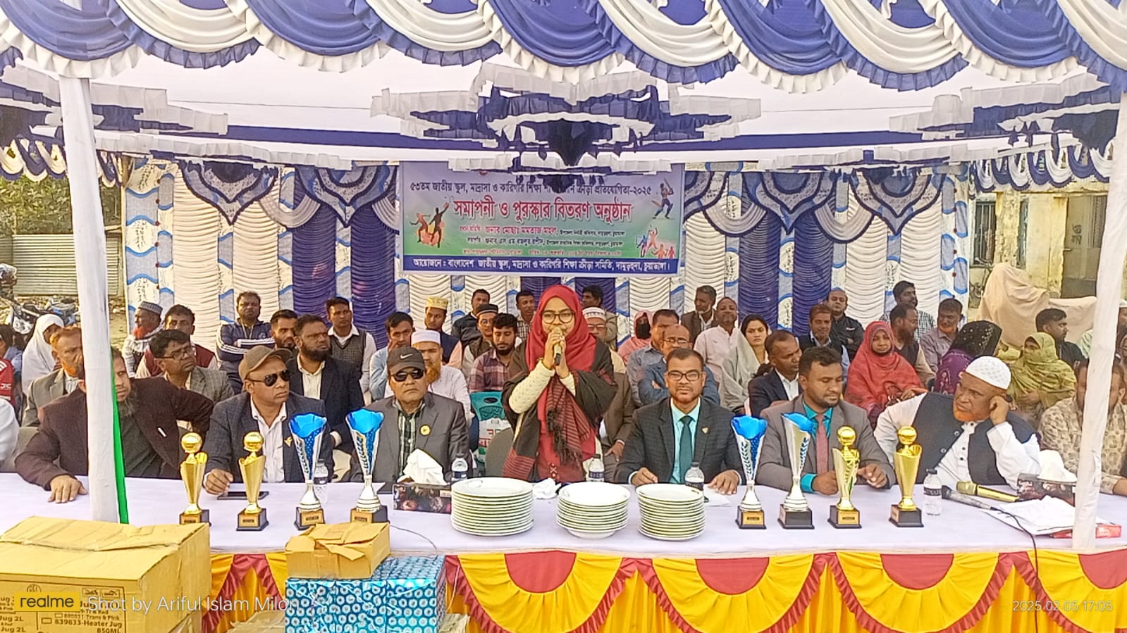 ‘এসো দেশ বদলায়, পৃথিবী বদলায়’ এই স্লোগানকে সামনে রেখে নতুন বাংলাদেশ গড়ার প্রত্যয়ে তারুণ্যের উৎসব উপলক্ষে বাংলাদেশ জাতীয় স্কুল, মাদ্রাসা ও কারিগরি শিক্ষা ক্রীড়া সমিতি দামুড়হুদা উপজেলার অয়োজনে ৫৩ তম জাতীয় স্কুল- মাদ্রাসা ও কারিগরি শিক্ষা শীতকালীন ক্রীড়া, অ্যাথলেটিক প্রতিযোগিতার সমাপনী ও পুরস্কার বিতরণ অনুষ্ঠান অনুষ্ঠিত হয়েছে। অনুষ্ঠানে প্রধান অতিথি হিসেবে উপস্থিত থেকে বক্তব্য রাখেন, দামুড়হুদা উপজেলা নির্বাহী অফিসার মমতাজ মহল। গতকাল বুধবার দুপুর সাড়ে ৪ টার সময় দামুড়হুদা স্টেডিয়াম মাঠে অনুষ্ঠিত গত ২৯শে জানুয়ারী থেকে শুরু হওয়া ৪৭ টি ইভেন্টের শীতকালীন ক্রীড়া, এ্যাথলেটিক প্রতিযোগিতার পুরস্কার বিতরণ ও সমাপনী অনুষ্ঠান অনুষ্ঠিত হয়। এতে দামুড়হুদা উপজেলার মোট ৫৩ টি মাধ্যমিক স্কুল ও মাদ্রাসার শিক্ষার্থীরা বিভিন্ন ক্রীড়া ও এ্যাথলেটিক প্রতিযোগিতায় অংশগ্রহণ করে নিজেদের যোগ্যতা মেলে ধরে পুরস্কার অর্জন করেন। দামুড়হুদা উপজেলা মাধ্যমিক শিক্ষা অফিসার এস,এম বজলুর রশীদ এর সভাপতিত্বে বিশেষ অতিথি হিসাবে উপস্থিত থেকে বক্তব্য রাখেন, দামুড়হুদা থানা বিএনপির সভাপতি মনিরুজ্জামান মনির, সাধারণ সম্পাদক রফিকুল হাসান তনু, উপজেলা জামায়াতের আমির নায়েব আলী, উপজেলা মাধ্যমিক স্কুল একাডেমিক সুপারভাইজার রাফিজুল ইসলাম। এ সময় বক্তারা বলেন, খেলাধুলায় মানসিক দৃঢ়তা, দলগত চেতনা এবং নৈতিকতার বিকাশ ঘটায় উল্লেখ করে শিক্ষার্থীদেরকে স্বপ্ন পূরণ করতে হলে পড়ালেখার পাশাপাশি খেলাধুলার আহবান জানান। তারা বলেন, যারা এই ক্রীড়া প্রতিযোগিতায় অংশগ্রহণ করেছো, তোমরা প্রত্যেকেই এখানে স্বপ্ন নিয়ে এখানে এসেছো। কেউ বিজয়ী হয়েছো, আবার কেউ পরাজিত হয়েছো। তবে জয়-পরাজয় মুখ্য বিষয় নয় বরং নিজ নিজ যোগ্যতাকে মেলে ধরার জন্য বৃহৎ পরিসরের এই ক্রীড়া ইভেন্টে অংশগ্রহণ করেছো এটাই মুখ্য বিষয়। বক্তারা বলেন, খেলা শুধুমাত্র শারীরিক সক্ষমতার পরীক্ষা নয়, এই খেলাধুলার মাধ্যমে শেখা যায় কীভাবে জয়ের আনন্দ উদযাপন করতে হয়। পাশাপাশি পরাজয়ের অভিজ্ঞতা থেকে শিক্ষা গ্রহণ করা যায়। কার্পাসডাঙ্গা মাধ্যমিক বালিকা বিদ্যালয়ের সহকারি শিক্ষক জাহিদুল ইসলামের সঞ্চালনায় উপস্থিত ছিলেন, দামুড়হুদা প্রেসক্লাবের সভাপতি শামসুজ্জোহা পলাশ, দামুড়হুদা সরকারি পাইলট হাই স্কুলের প্রধান শিক্ষক নজরুল ইসলাম, উপজেলা মাধ্যমিক শিক্ষক সমিতির সভাপতি কুতুবপুর মাধ্যমিক বিদ্যালয়ের প্রধান শিক্ষক আব্দুল বারী, সাধারণ সম্পাদক পাটাচোরা মাধ্যমিক বিদ্যালয়ের প্রধান শিক্ষক শাহজান আলী, কোষাধাক্ষ্য জুড়ানপুর মাধ্যমিক বিদ্যালয়ের প্রধান শিক্ষক একরামুল হকসহ বিভিন্ন মাধ্যমিক স্কু