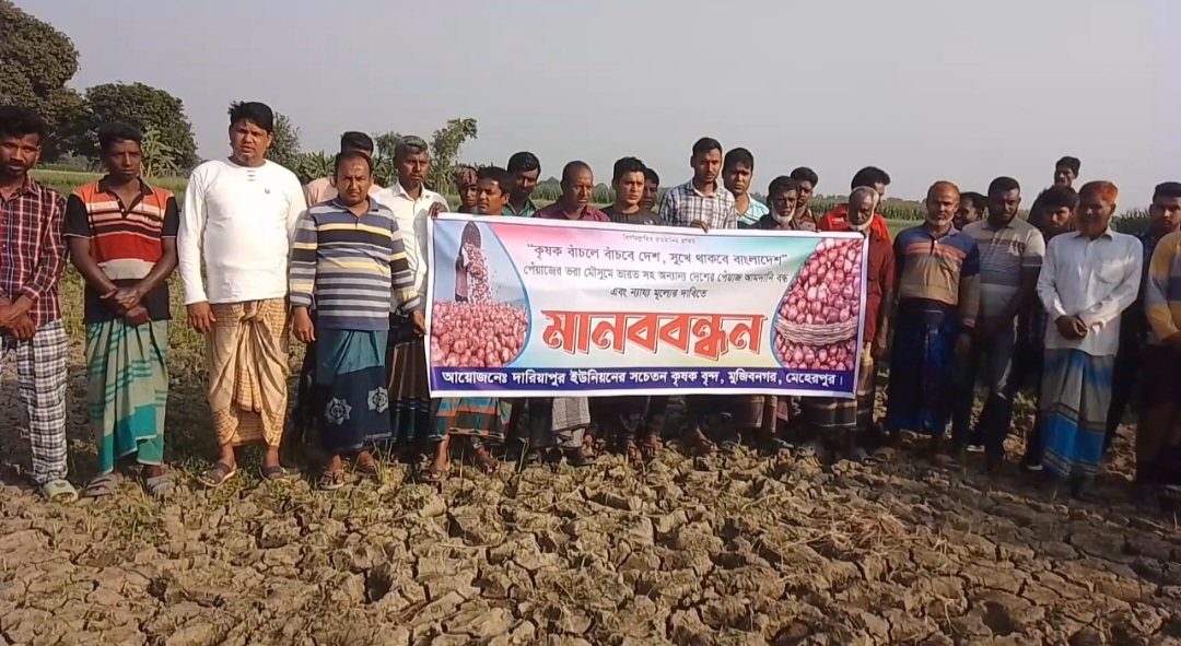পেঁয়াজের ভরা মৌসুমে পার্শ্ববর্তী দেশ ভারতসহ অন্যান্য দেশ থেকে পেঁয়াজ আমদানি বন্ধ ও কৃষকের উৎপাদিত পেঁয়াজের ন্যায্য মূল্য নিশ্চিত করতে মানববন্ধন করেছেন মুজিবনগরের পেঁয়াজ চাষীরা। গতকাল বৃহস্পতিবার বিকালে মুজিবনগর উপজেলার দারিয়াপুর মাঠে শতাধিক পেঁয়াজ চাষী এই মানববন্ধন করেন।