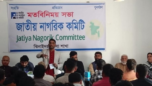 জাতীয় নাগরিক কমিটি ঝিনাইদহ জেলার শাখার বিশেষ মতবিনিময় সভা অনুষ্ঠিত হয়েছে। জাতীয় নাগরিক কমিটি জেলা শাখার আয়োজনে গতকাল রবিবার সকালে শহরের নতুন হাটখোলা এলাকায় সংগঠনটির জেলা কার্যালয়ে এ সভার আয়োজন করা হয়। এতে অতিথি হিসেবে উপস্থিত ছিলেন ঝিনাইদহ জেলা নাগরিক কমিটির প্রধান সংগঠক নাসির আল সাদী। বিশেষ অতিথি হিসেবে উপস্থিত ছিলেন বৈষম্য বিরোধী ছাত্র আন্দোলনের কেন্দ্রীয় নেতা তারিক রেজা। আরও উপস্থিত ছিলেন ঝিনাইদহ জেলা নাগরিক কমিটির নেতা তারেক বাবু, আরেফিন কায়সার, আলাউদ্দিন জোয়ারদার, শাম্মী পারভিন, হাবিবুর রহমান, মুজাহিদুল ইসলাম, বৈষম্য বিরোধী ছাত্র আন্দোলনের সদস্য সচিব সাইদুর রহমান ও সিনিয়র যুগ্ম আহ্বায়ক মনির হোসেন। এছাড়াও কোটচাঁদপুর উপজেলার মামুন, মোকলেসুর, হাবিবুর, মহেশপুর উপজেলার আবুল কালাম আজাদ, হরিণাকুণ্ডু উপজেলার আলমগীরসহ বিভিন্ন উপজেলার নেতৃবৃন্দ সভায় অংশ নেন। সভায় উপস্থিত নেতৃবৃন্দ নাগরিক অধিকার ও সামগ্রিক উন্নয়ন নিয়ে মতামত প্রদান করেন এবং জাতীয় নাগরিক কমিটির ভবিষ্যৎ পরিকল্পনা নিয়ে বিস্তারিত আলোচনা করেন।