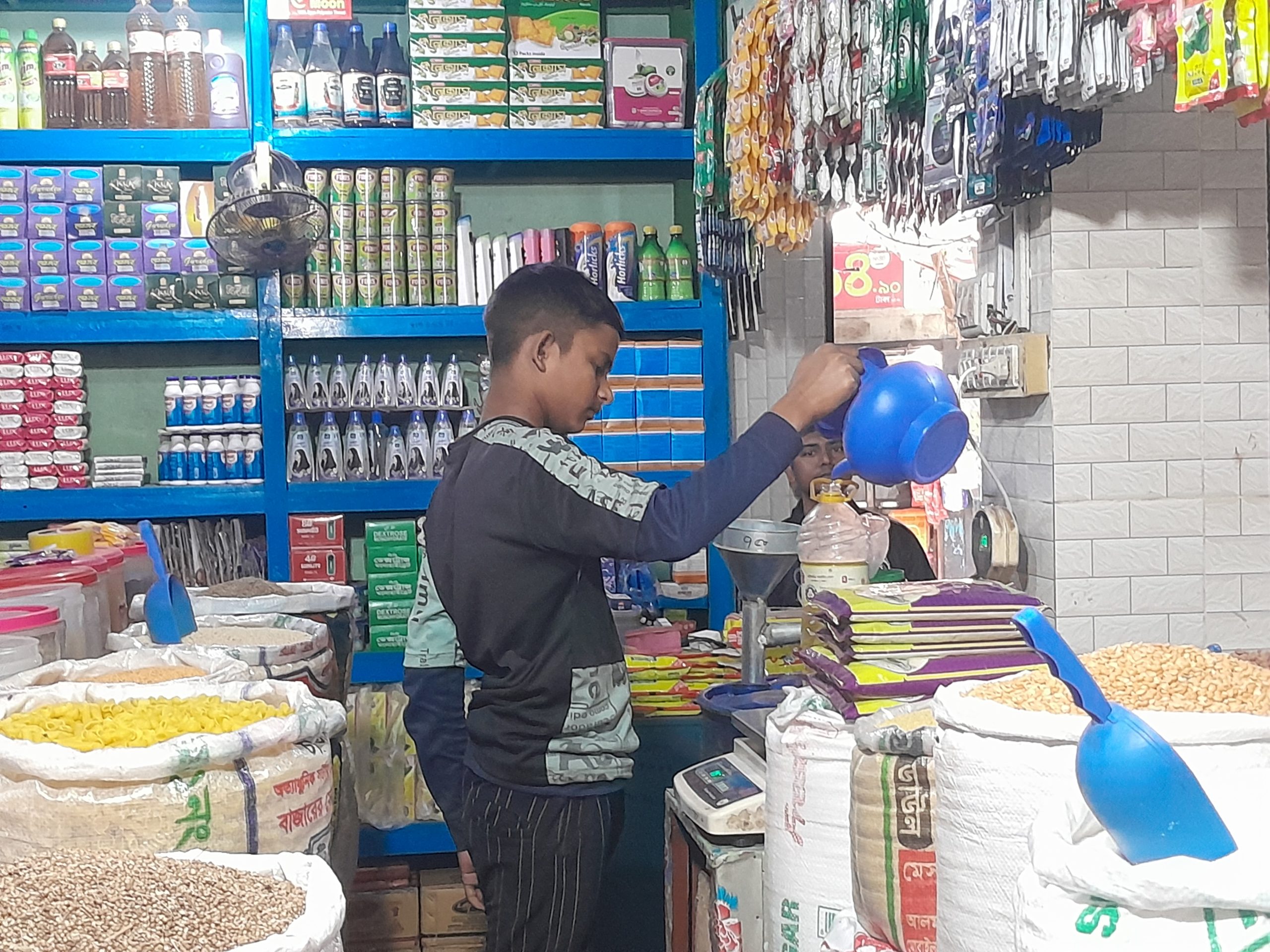 বাজারের খুচরা মুদি ব্যবসায়িরা জানান, এক ও দুই লিটার তেল একদমই নেই। যদিও বা ৫ লিটার তেল কোম্পানি দিচ্ছে কিন্তু এই তেলের সাথে এক কেজি পোলাও চাল ৫ কেজি প্যাকেট আটা কিংবা অন্যান্য পন্য। এই পন্যগুলা না নিলে সয়াবিন তেল দিচ্ছে না কোম্পানির প্রতিনিধিরা। আবার অনেক ক্রেতারা তেলের সাথে কন্ডিশন পণ্যগুলো নিচ্ছে না। যে কারণে বাড়তি পন্যগুলো দোকানে পড়ে থাকছে। মূলত কোম্পানিই এই কারসাজি করছে।