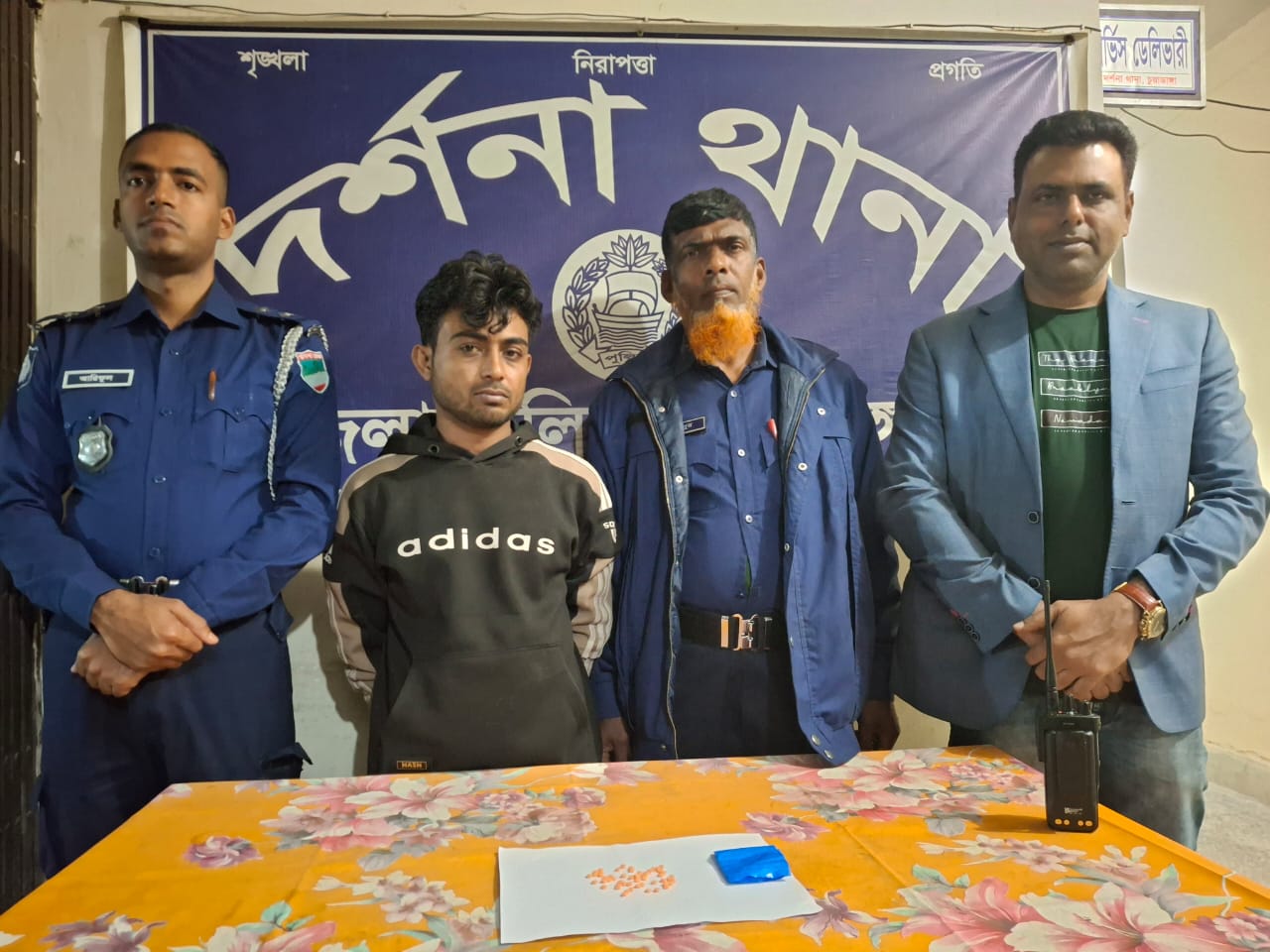 দর্শনা থানা পুলিশের অভিযানে ৫২ পিস ইয়াবা ট্যাবলেটসহ শান্তিপাড়ার মাদক ব্যবসায়ী বিপ্লব (২৮) গ্রেফতার হয়েছেন। গত শুক্রবার দিবাগত রাত পৌঁনে ১টার দিকে তাকে গ্রেফতার করা হয়। গ্রেফতারকৃত হাবিবুর হাকিম ওরফে বিপ্লব (২৮) দর্শনা পৌর এলাকার শান্তিপাড়ার আকরাম খাঁর ছেলে। পুলিশ জানায়, গোপন সংবাদের প্রেক্ষিতে থানার এসআই মাসুদুর রহমান সঙ্গীয় ফোর্স দর্শনা পৌরসভাধীন পাঠানপাড়া ও ইসলাম বাজারে অভিযান চালায়। এসময় শান্তিপাড়া সড়কের সুগন্ধা মাঠ সংলগ্ন পাকা রাস্তার উপর থেকে হাবিবুর হাকিম ওরফে বিপ্লবকে (২৮) অবৈধ মাদকদ্রব্য ৫২ পিস ইয়াবা ট্যাবলেটসহ গ্রেফতার করেন।