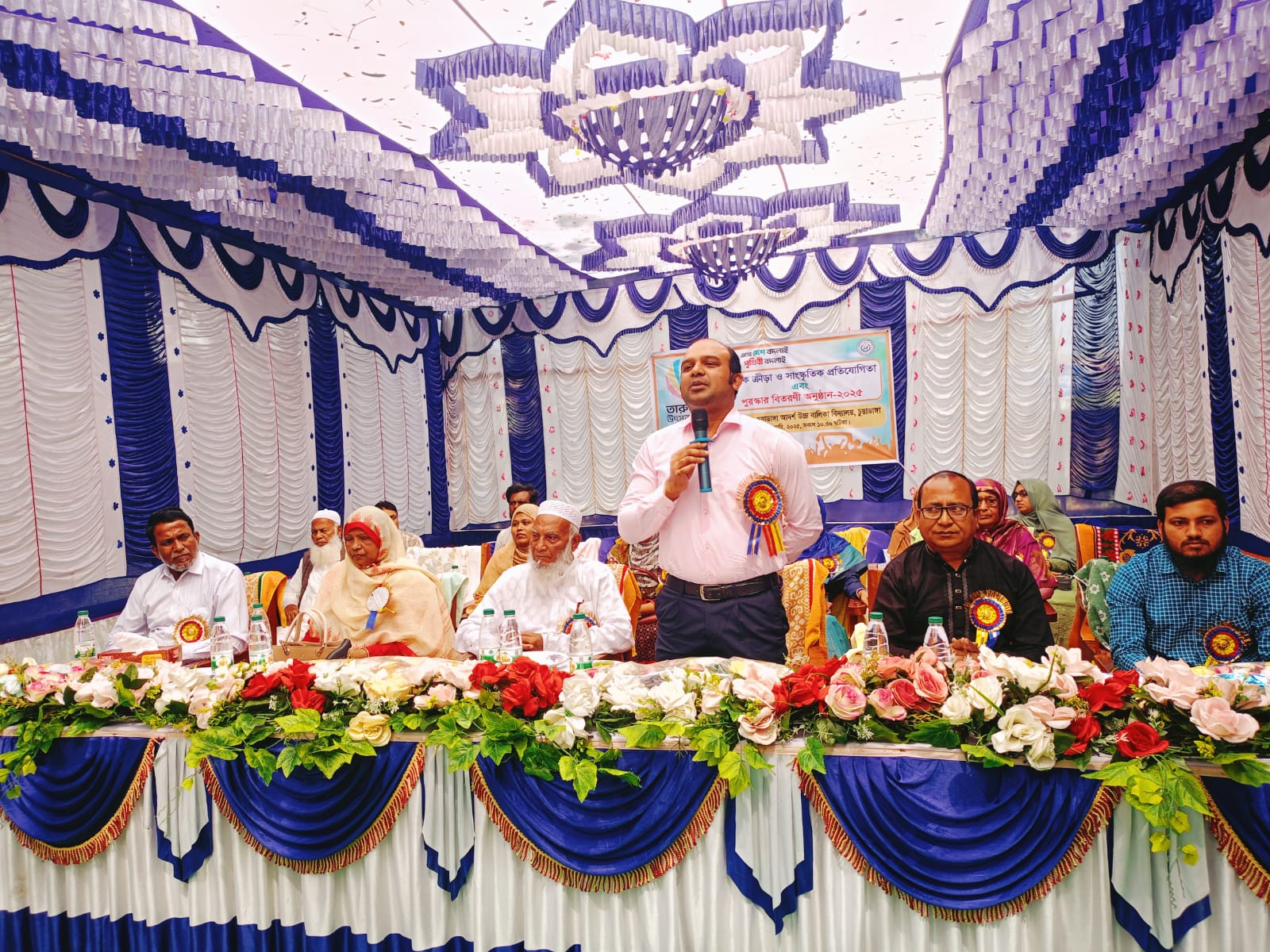 ‘এসো দেশ বদলায় পৃথিবী বদলায়’ এই স্লোগানকে সামনে রেখে তারুণ্যের উৎসব উদযাপনের অংশ হিসেবে চুয়াডাঙ্গা আদর্শ বালিকা উচ্চ বিদ্যালয়ের বার্ষিক ক্রীড়া ও সাংস্কৃতিক প্রতিযোগিতার পুরস্কার বিতরণ সম্পন্ন হয়েছে। গতকাল সোমবার সকাল সাড়ে ১০টায় বিদ্যালয় চত্বরে আগত আমন্ত্রিত অতিথিদের শিক্ষার্থীরা ফুলেল শুভেচ্ছাসহ ব্যাজ পরিধান করান। অতিথিদের মূল মঞ্চে আসন গ্রহণের পর পরই বিদ্যালয়ের ধর্মীয় শিক্ষক হাফেজ হারুন অর রশিদের কোরআন তেলাওয়াতের মধ্য দিয়ে শুরু হয় মূল অনুষ্ঠানিকতা ।