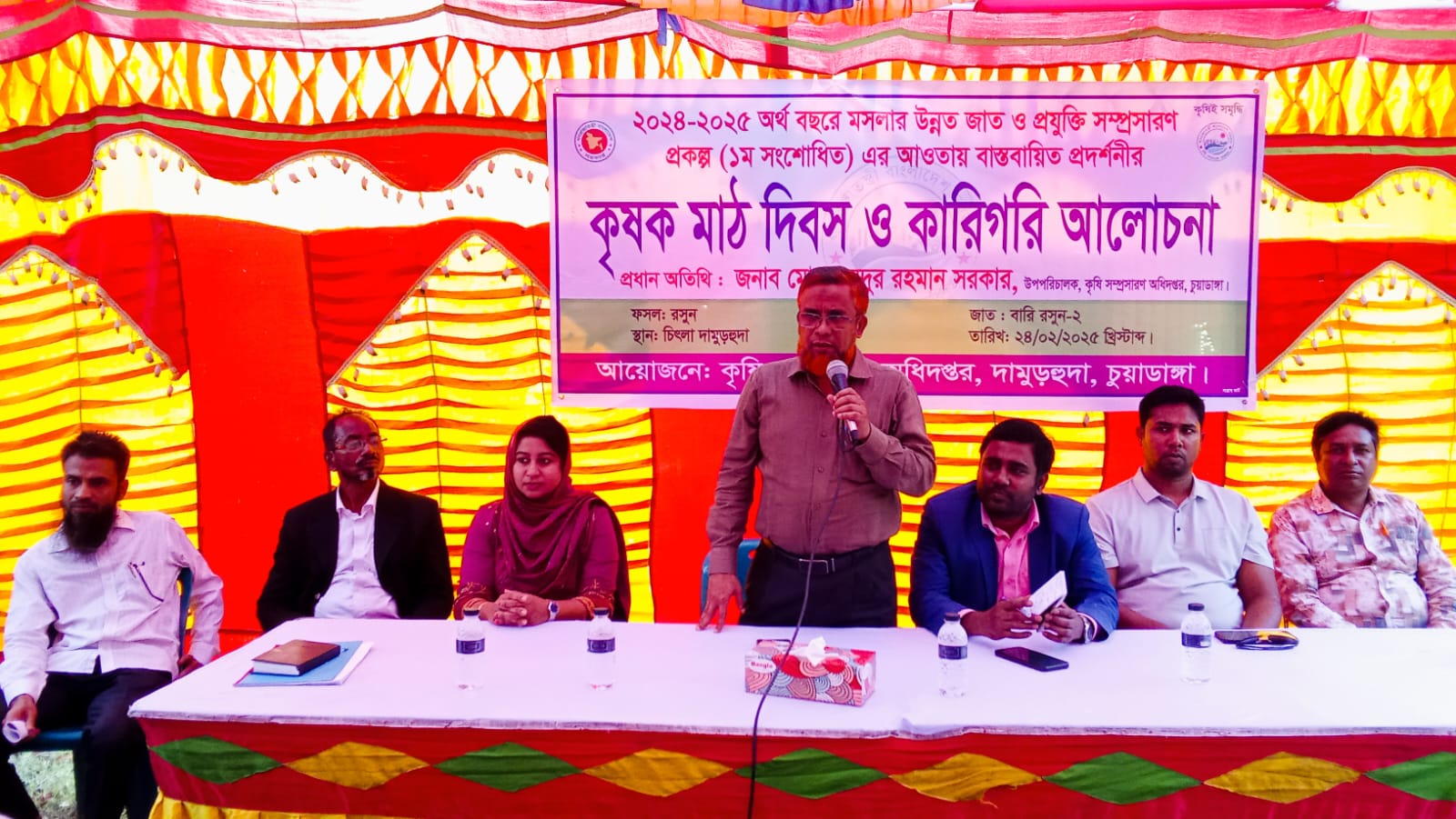 অনুষ্ঠানে প্রধান অতিথি হিসাবে উপস্থিত থেকে বক্তব্য রাখেন, কৃষি সম্প্রসারণ অধিদপ্তর, চুয়াডাঙ্গা কার্যালয়ের উপ-পরিচালক মাসুদুর রহমান সরকার। এসময় তিনি বলেন, রসুন একটি ঔষধী গুণসম্পন্ন উচ্চমূল্যের মসলা ও জাতীয় ফসল। আমরা আমাদের দেশে যে দেশীয় রসুন উৎপাদন করি সেটা বিশ্বের অন্যান্য দেশের তুলনায় বহু গুণগতমান সম্পন্ন। আপনারা দেখেছেন করোনাকালীন সময়ে বিশ্বের অন্যান্য দেশের তুলনায় আমাদের দেশে মৃত্যুহার অনেক কম ছিল। এর কারণ হলো আমাদের মাটিতে উৎপাদিত যে ফসল এবং মসলা জাতীয় ফসল ফলায় তা বিশ্বের অন্যান্য দেশের ফসলের তুলনায় অনেক পুষ্টিগুণ ও রোগ প্রতিরোধী ক্ষমতা সম্পন্ন। যে কারণে আমাদের শরীরে অ্যান্টিঅক্সিজেন বেশি থাকার কারণে মৃত্যুর হার কমাতে সক্ষম হয়েছ। তিনি আরও বলেন, প্রতি বছর আমাদেরকে বিদেশ থেকে ডলার খরচ করে রসুন আমদানি করতে হয় যেটা আমাদের জন্য অনেকটাই ব্যায় বহুল হয়ে দাঁড়ায়। এ থেকে বেরিয়ে আসতে হবেন। আমাদের বাংলার মাটিতে বহুগুণ উর্বরশক্তি রয়েছে, ফলে কৃষক ভাইয়েরা যে কোন ফসল যত্ন সহকারে চাষাবাদ করলে উৎপাদন বৃদ্ধি ও লাভবান হবেন। সরকার মশলা চাষের উপর যথেষ্ট গুরুত্ব দিয়েছে জানিয়ে তিনি আরও বলেন, আগামীতে যারা রসুন উৎপাদন করবেন সেই সমস্ত কৃষক ভাইয়ের সর্বোচ্চ কৃষি বিভাগ জ্ঞান ও কারিগরি প্রযুক্তিসহ সমস্ত প্রকারের সহায়তা নিয়ে পাশে থাকবেন বলে আশাব্যাক্ত করেন।