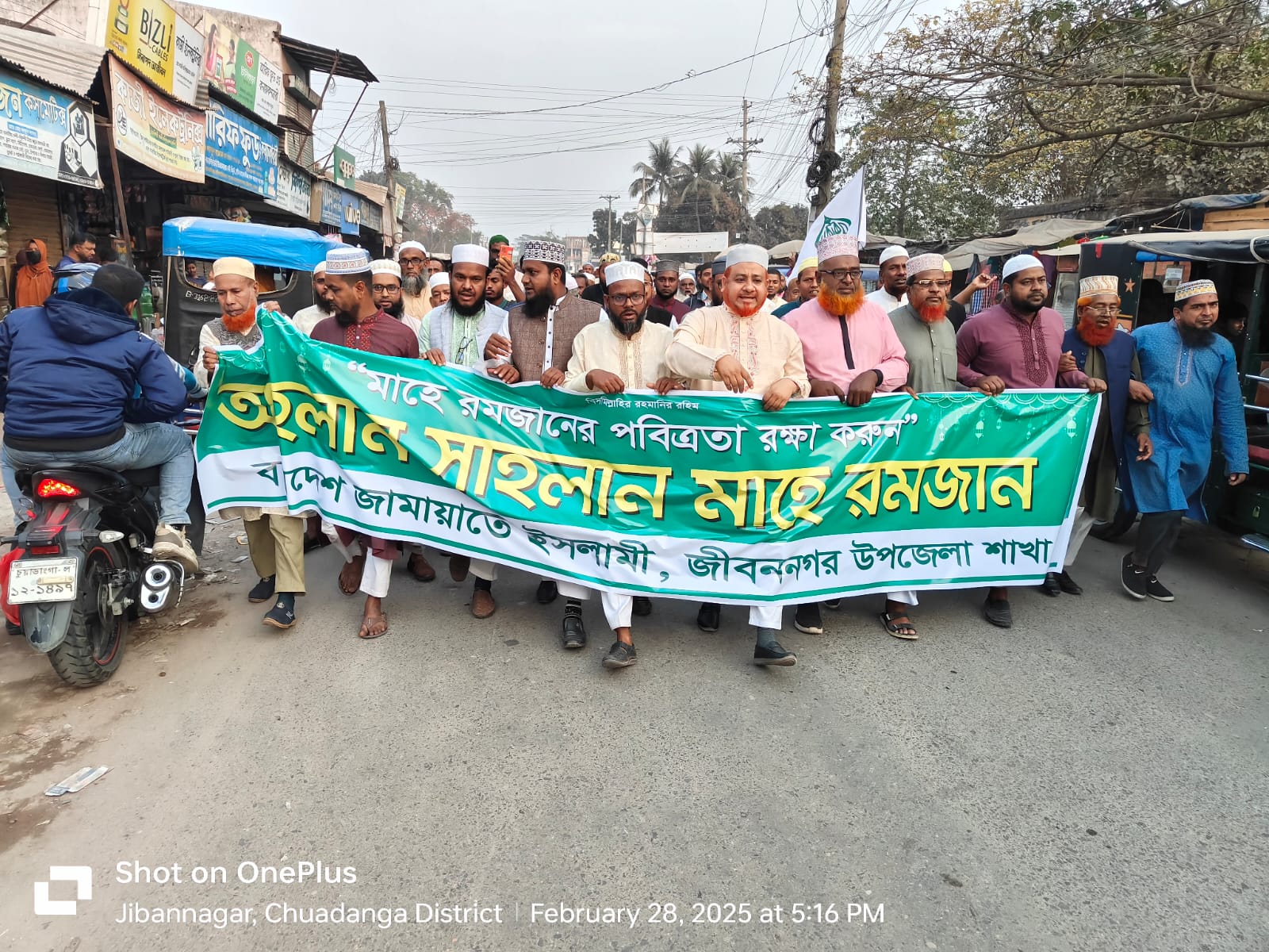 পবিত্র মাহে রমজানকে স্বাগত জানিয়ে জীবননগরে র‌্যালি বের করে জামায়াতে ইসলামী। গতকাল শুক্রবার বিকালে জীবননগর উপজেলা জামায়াতে ইসলামীর উদ্যোগে বাস স্ট্যান্ডের মুক্তমঞ্চ প্রাঙ্গণ থেকে শুরু হয়ে শহরের প্রধান প্রধান সড়ক প্রদক্ষিণের মাধ্যমে র‌্যালিটি একই স্থানে শেষ হয়। সেখানে এক সংক্ষিপ্ত পথসভা অনুষ্ঠিত হয়। পথসভায় প্রধান অতিথি হিসেবে উপস্থিত ছিলেন, জামায়াতে ইসলামীর চুয়াডাঙ্গা জেলা আমির ও চুয়াডাঙ্গা-২ আসনের জামায়াতে ইসলামীর এমপি প্রার্থী রুহুল আমিন। এছাড়াও জেলা তারবিয়াত সম্পাদক জিয়াউল হক, জেলা মাজলিসূল মুফাসসিরিন সভাপতি মাওলানা হাফিজুর রহমান, জেলা উলামা সম্পাদক মাও. ইসরাইল হোসেন, জেলা পেশাজীবী সম্পাদক অধ্যাপক খলিলুর রহমান, জেলা শ্রমিক সভাপতি মাহফুজুর রহমান, জীবননগর উপজেলা আমির মাওলানা সাজেদুর রহমান, উপজেলা নায়েবে আমির হাফেজ মাওলানা বেলাল হোসেন, সেক্রেটারি সাখাওয়াত হোসেন, সহকারী সেক্রেটারি মাওলানা সাইদুর রহমান, সহকারী সেক্রেটারি মাওলানা আবু বকর সিদ্দিক, বায়তুল মাল সম্পাদক আসাবুল মল্লিক, আইটি সম্পাদক হারুন অর রশিদ, জীবননগর পৌর আমির মাওলানা ফিরোজ হোসেন, সেক্রেটারি ইবরাহিম খলিল, সহকারী সেক্রেটারি আহমদ আলী, পৌর বায়তুল মাল সম্পাদক সিরাজুল ইসলাম মাষ্টারসহ উপজেলা ও পৌর জামায়াতে ইসলামী ও ইসলামী ছাত্রশিবিরের বিভিন্ন পর্যায়ের নেতা-কর্মীরা অংশগ্রহণ করেন।