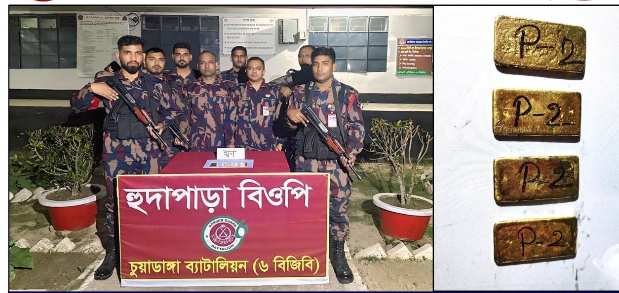 গতকাল শুক্রবার এক প্রেস বিজ্ঞপ্তির মাধ্যমে চুয়াডাঙ্গা-৬ বিজিবি জানায়, গোয়েন্দা তথ্যের ভিত্তিতে জানতে পারে- দামুড়হুদার হুদাপাড়া সীমান্ত দিয়ে ভারতে পাচারের উদ্দেশ্যে স্বর্ণের একটি চালান যাবে। স্বর্ণের বার উদ্ধারে হুদাপাড়ায় অভিযানে নামে একদল বিজিবি। গুরুত্বপূর্ণ সীমান্ত পিলারের ৯৬/৪-এস থেকে আনুমানিক ৩০০ গজ বাংলাদেশের অভ্যন্তরে হুদাপাড়া গ্রামে অ্যাম্বুশ করে। হুদাপাড়া গ্রামের মৃত রমজান আলী খানের ছেলে হারুনের (৩৫) বসতবাড়ীর অদূরে একটি পরিত্যক্ত গোয়াল ঘরে তল্লাশী অভিযান পরিচালনা করে। অভিযান চলাকালে বিজিবি সদস্যদের উপস্থিতি টের পেয়ে বাড়ীর মালিক হারুন কৌশলে পালিয়ে যায়। পরে বিজিবি সদস্যরা গোয়াল ঘরের ভিতর ঝুলানো একটি নেটের ব্যাগের মধ্যে সাদা বাইন্ডিং টেপ দ্বারা মোড়ানো ২টি প্যাকেট জব্দ করে। জব্দকৃত প্যাকেট থেকে কালো স্কচটেপ দ্বারা মোড়ানো ৪ টি স্বর্ণের বার উদ্ধার করতে সক্ষম হয়।