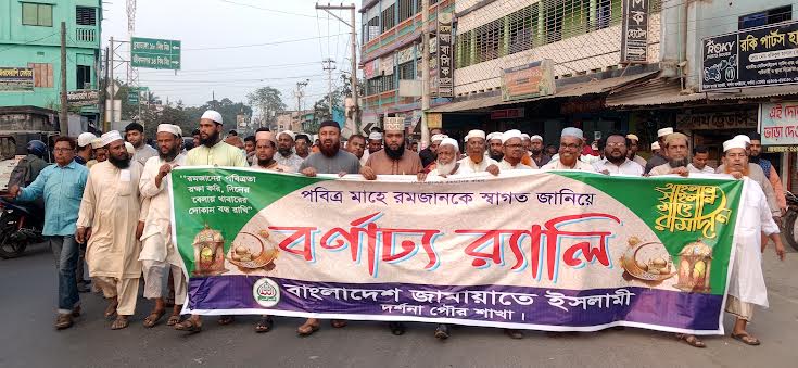 দর্শনায় পবিত্র মাহে রমজানকে স্বাগত, রমজানের পবিত্রতা রক্ষা ও দ্রব্যমূল্য নিয়ন্ত্রণের দাবি জানিয়ে র্যালি ও সমাবেশ করেছে বাংলাদেশ জামায়াতে ইসলামী। গতকাল শনিবার বাদ আসর দর্শনা বাসস্ট্যান্ড থেকে বর্ণ্যাঢ্য র্যালিটি শুরু হয়ে দর্শনার প্রধান প্রধান সড়ক প্রদক্ষিণ শেষে দর্শনা রেলবাজারস্থ মুক্ত মঞ্চে গিয়ে সংক্ষিপ্ত আলোচনা অনুষ্ঠিত হয়। র্যালি শেষে দর্শনা থানা আমীর মাও. রেজাউল ইসলামের সভাপতিত্বে সমাবেশে বক্তব্য রাখেন, জেলা জামায়াতের সহকারী সেক্রেটারী আব্দুল কাদের, জেলা টিম সদস্য আব্দুর রউফ ও মাজলিসুল মুফাসিরিনের কেন্দ্রীয় নেতা মাওলানা আবু জার গিফারী।