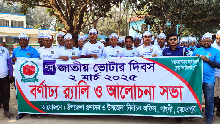 ‘তোমার আমার বাংলাদেশে, ভোট দিব মিলেমিশে’ প্রতিপাদ্যে মেহেরপুরের গাংনীতে জাতীয় ভোটার দিবস উদযাপন করা হয়েছে। গতকাল রবিবার সকালে উপজেলা প্রশাসন ও উপজেলা নির্বাচন অফিসের আয়োজনে একটি বর্ণাঢ্য র্যালি বের হয়। র্যালিটি উপজেলা চত্বর থেকে শুরু হয়ে প্রধান সড়ক প্রদক্ষিণ করে একই স্থানে এসে শেষ হয়। গাংনী উপজেলা নির্বাহী অফিসার প্রীতম সাহার সভাপতিত্বে আলোচনা সভায় প্রধান আলোচক হিসেবে বক্তব্য রাখেন ভারপ্রাপ্ত উপজেলা নির্বাচন অফিসার নাহিদ হাসান। বক্তব্য রাখেন সাবেক মুক্তিযোদ্ধা কমান্ডার শামসুল আলম সোনা, গাংনী প্রেসক্লাবের সভাপতি তৌহিদ উদ দৌলা রেজা, গাংনী পাইলট মাধ্যমিক বিদ্যালয়ের সাবেক প্রধান শিক্ষক আব্দুর রাজ্জাক, ডিজেএমসি মাধ্যমিক বিদ্যালয়ের প্রধান শিক্ষক রফিকুল ইসলাম, গাংনী থানার এসআই সাজ্জাদ হোসেন, সাংবাদিক রফিকুল আলম বকুল। এসময় বিভিন্ন শিক্ষাপ্রতিষ্ঠানের শিক্ষকবৃন্দ এবং উপজেলা প্রশাসনের বিভিন্ন দপ্তরের সরকারি কর্মকর্তা-কর্মচারীরা অংশগ্রহন করেন। বক্তারা বলেন, আঠারো বছর বয়স হলেই একজন নাগরিক ভোটার হওয়ার সুযোগ পেয়ে থাকে। ভোটার তালিকা হালনাগাদ করা হয়েছে। অনলাইনে যাচাই বাছাই করে একটি সুষ্ঠু ভোটার তালিকা তৈরী করে আগামীতে একটি অবাধ, সুষ্ঠু ও নিরপেক্ষ নির্বাচনের আশাবাদ ব্যক্ত করেন।