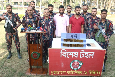 চুয়াডাঙ্গা সদরের হায়দারপুরে ৬-বিজিবি ব্যাটালিয়েনের সদর দপ্তরের সামনে পূর্বাশা পরিবহনের একটি যাত্রীবাহী বাস তল্লাশী করে ১৮টি স্বর্ণের বার জব্দ করেছে বিজিবি সদস্যরা। এসময় আটক করা হয়েছে দুই পাচারকারীকে। গতকাল মঙ্গলবার দুপুরে এ অভিযান চালানো হয়। আটককৃতরা হলেন, চুয়াডাঙ্গা দামুড়হুদার পীরপুরকুল্লাহ গ্রামের মৃত খোদা বক্সের ছেলে রফিকুল ইসলাম (৪২) ও কুমিল্লা দেবীদ্বার হোসেনপুর গ্রামের মোসলেম উদ্দিনের ছেলে লিটন খান (২৬)।