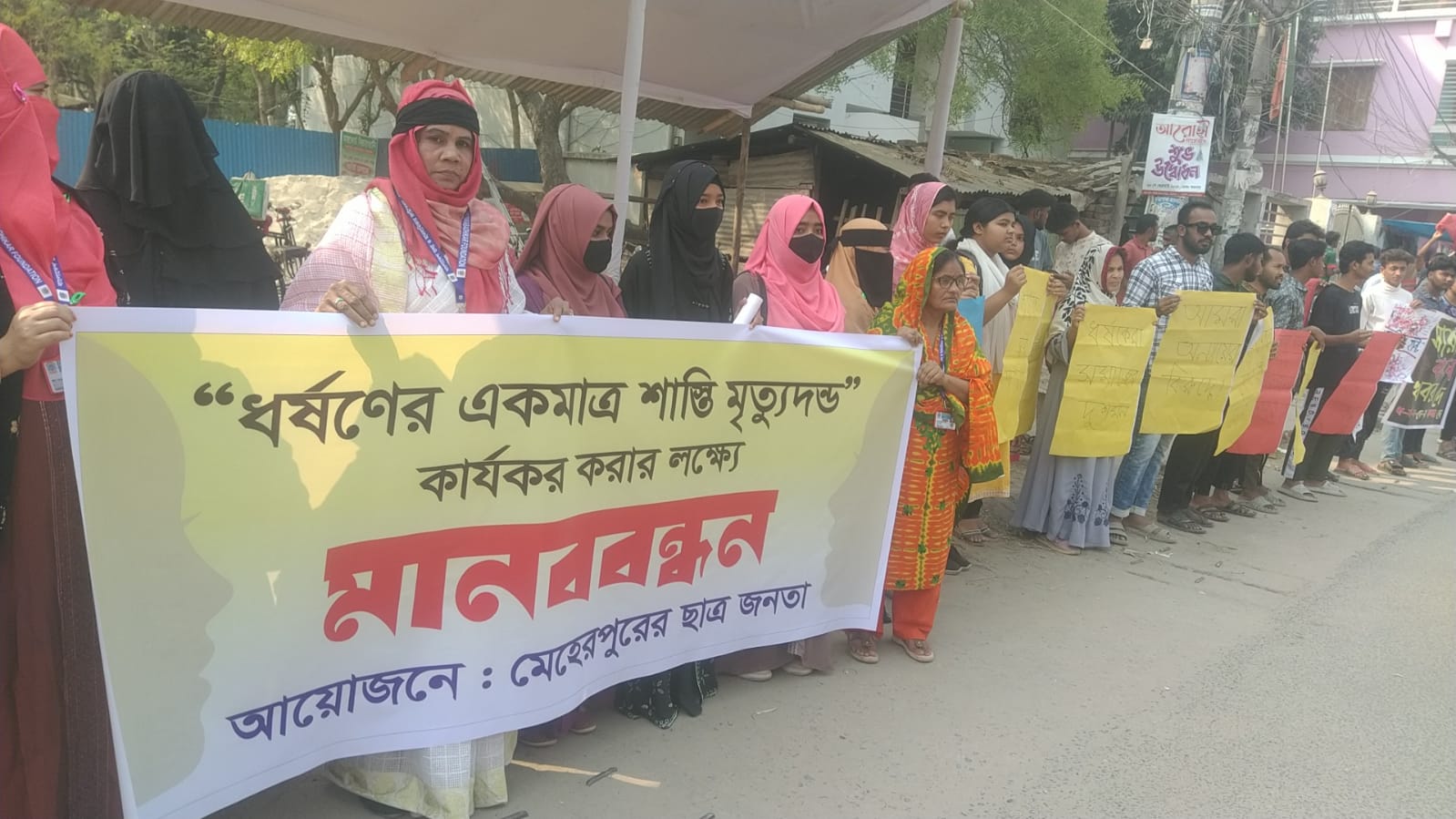 ধর্ষকের একমাত্র শাস্তি মৃত্যুদন্ড কার্যকর করার লক্ষ্যে মেহেরপুরে মানববন্ধন কর্মসূচি পালন করা হয়েছে। গতকাল রবিবার দুপুরে ছাত্র-জনতার উদ্যোগে মেহেরপুর প্রেস ক্লাবের সামনে এই মানববন্ধন কর্মসূচির আয়োজন করা হয়। এসময় শিক্ষার্থীদের ‘ধর্ষকের ফাঁসি চাই’, ‘আমার সোনার বাংলায়, ধর্ষকের ঠাঁই নাই’, ‘ধর্ষণের শাস্তি মৃত্যুদণ্ড দিতে হবে’, আশ্বাস নয়, আইনের বাস্তবায়ন চাই’, তুমি কে, আমি কে আছিয়া আছিয়া, ‘উই ওয়ান্ট জাস্টিস, উই ওয়ান্ট জাস্টিস’, ‘ধর্ষকদের মৃত্যুদণ্ড কার্যকর করতে হবে’, ইত্যাদি স্লোগান ও প্ল্যাকার্ড হাতে দেখা যায়। মানববন্ধন কর্মসূচি চলাকালে অনুষ্ঠিত সমাবেশে বক্তরা বলেন, আইন-শৃঙ্খলা পরিস্থিতি অবনতি ও বিচারহীনতার কারণে ধর্ষণকারীরা বারবার ছাড় পেয়ে গেছে। বক্তারা বলেন, ধর্ষণকারীদের ঠিকানা এ বাংলায় হবে না। প্রশাসন যদি চুপ করে বসে থাকে তাহলে দেশের জনতাকে ধর্ষণকারীদের ধরে জনসমক্ষে এমন দৃষ্টান্তমূলক শাস্তি দিতে হবে, যেন তা দেখে আর যেন কেউ নারীদের দিকে কুদৃষ্টিতে তাকাতে সাহস না পায়। স্বাধীন বাংলায় নারী কোনো ভোগের পণ্য নয় যে, যখন ইচ্ছা তখনই তাদের ধর্ষণ করা যাবে। বিচারহীনতার সংস্কৃতি থেকে ফিরে না আসলে দেশের কেউ নিরাপদে থাকতে পারবে না।
