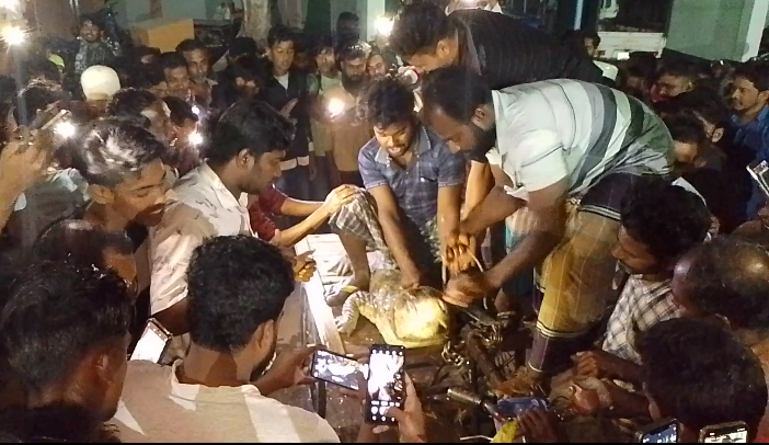 শিমুল খান নামের এলাকাবাসী জানান, গড়াই নদী থেকে প্রায় ৪শ ফুট উপরে ৬ নম্বর ওয়ার্ড খিলাফত মিয়ার বাড়ির দিকে যাচ্ছিল। সে সময় পাতার উপর দিয়ে যাওয়ার অবস্থায় খড়-মড় আওয়াজ শুনে এলাকাবাসী কুমিরটিকে দেখতে পায়। এরপর মাছ ধরা জাল দিয়ে কুমিরটিকে ঘেরাও করে ধরে ফেলে তারা। পরে কুমিরটিকে মজবুত করে বেঁধে এলাকায় আনন্দ মিছিল করে এলাকাবাসী।
