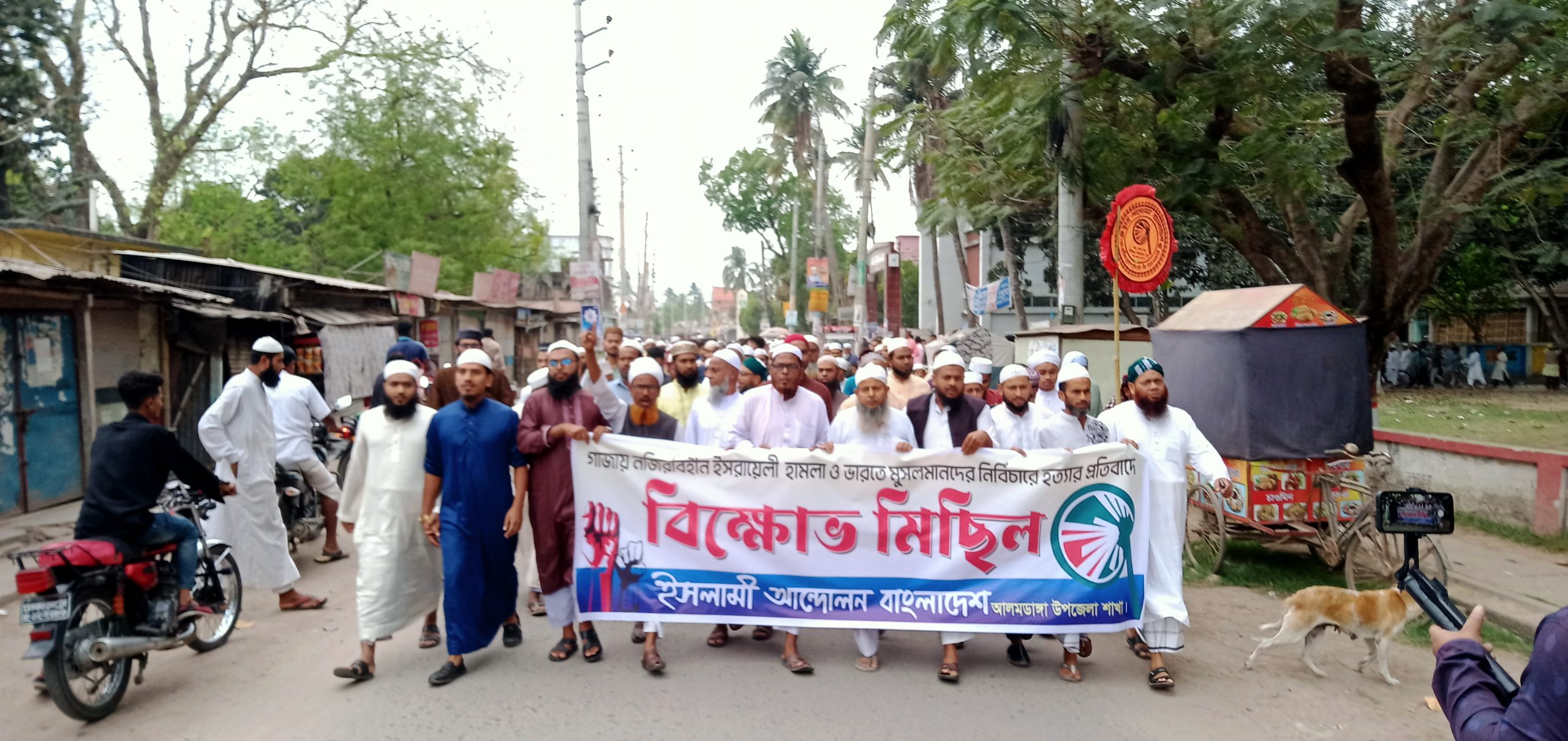 আলমডাঙ্গায় ফিলিস্তিনের গাঁজায় ইসরাইল বাহিনীর নজিরবিহীন হামলা ও ভারতে নির্বিচারে মুসলিম হত্যার প্রতিবাদে বিক্ষাভ মিছিল, প্রতিবাদ সভা ও দোয়া অনুষ্ঠিত হয়েছে। গতকাল শুক্রবার বাদ জুম্মাহ উপজলা মডেল মসজিদ থেকে ইসলামী আন্দোলন বাংলাদশ আলমডাঙ্গা উপজলা শাখার আয়াজনে বিক্ষাভ মিছিলটি শহরর প্রধান প্রধান সড়ক প্রদক্ষিণ করে। পর আলিফ উদ্দিন মোড়ে প্রতিবাদ সভা ও দোয়া অনুষ্ঠিত হয়। বিক্ষোভ মিছিল ও প্রতিবাদ সভায় উপস্থিত ছিলন ইসলামী আন্দোলন বাংলাদশ আলমডাঙ্গা উপজলা শাখা’র সভাপতি মাওলানা আকরাম হাসাইন সাইরাফী, সহ-সভাপতি ডা. ওয়ালিদ হাসান জোয়ার্দার, সেক্রেটারি আমিনুল হক, সাংগঠনিক সম্পাদক ফারুক হাসান, উপদেষ্টা মুফতি সিরাজুল ইসলাম, সদস্য মীর শফিকুল ইসলাম, আরও উপস্থিত ছিলন আলমডাঙ্গা কেদ্রীয় পুরাতন জাম মসজিদের খতিব মাওলানা জুলফিকার আলী, খেলাফত মজলিস আলমডাঙ্গা উপজলা শাখার সভাপতি মাওলানা আনিছুর রহমান, আলমডাঙ্গা আনন্দধাম মসজিদের খতিব মাওলানা ইমদাদুল হক সহ বিভিন্ন দলের নেতাকর্মী ও তৌহিদী জনতা।